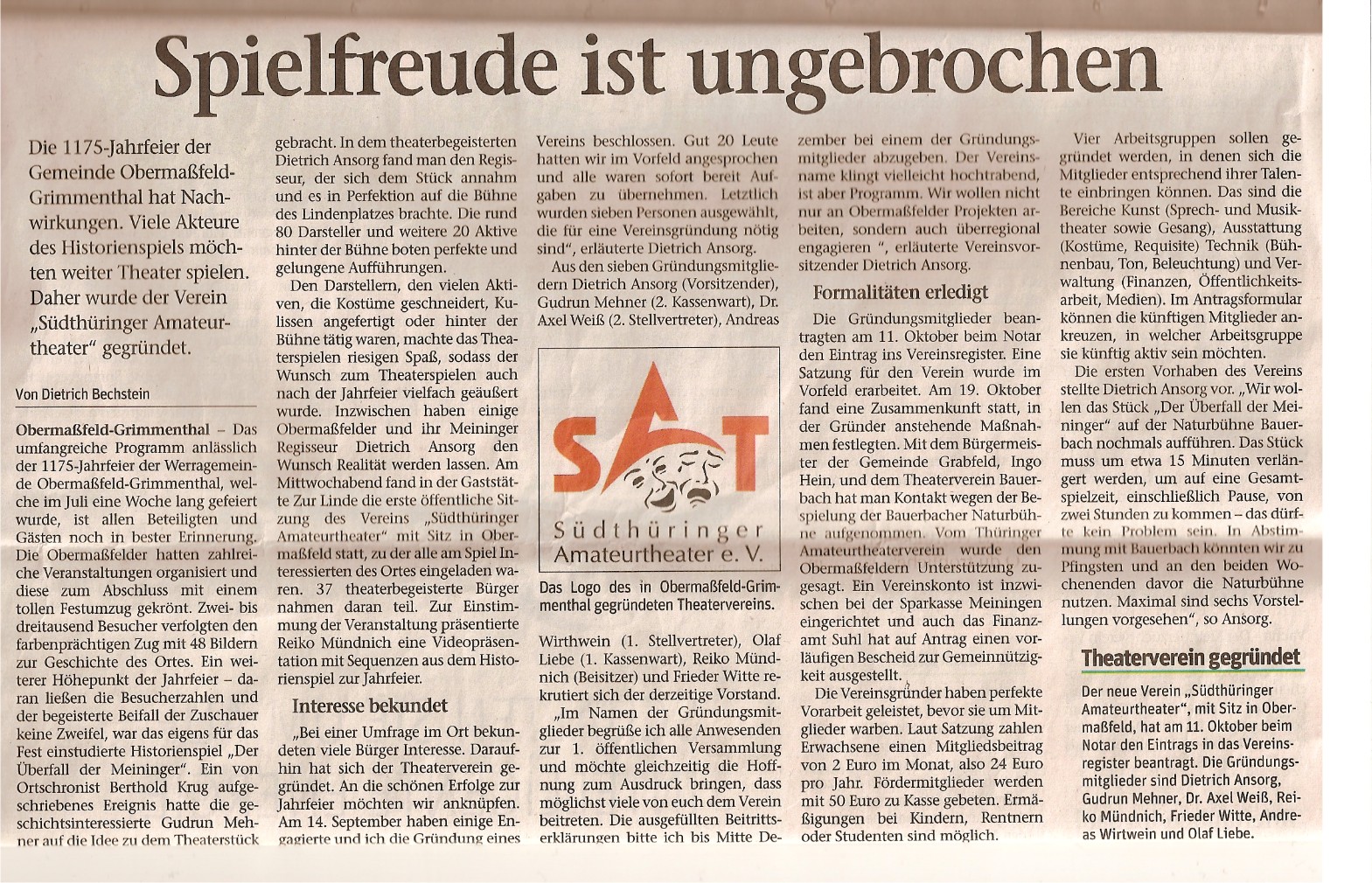 Der neue Verein "Südthüringer Amateurtheater" mit Sitz in Obermaßfeld, hat am 11. Oktober beim Notar den Eintrag in das Vereinsregister beantragt.
